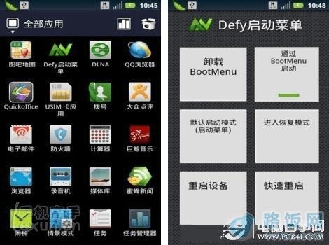 4、手机最后一次重启完成之后进入菜单界面选择“Defy启动菜单”,期间会提示授权申请,点击允许即可。在之后的界面里选择“安装BootMenu”,安装完成之后点击进入恢复模式。