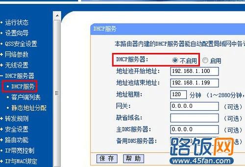 第一步:关机路由器的DHCP服务(“DHCP服务器”---“DHCP服务”),如下图所示。