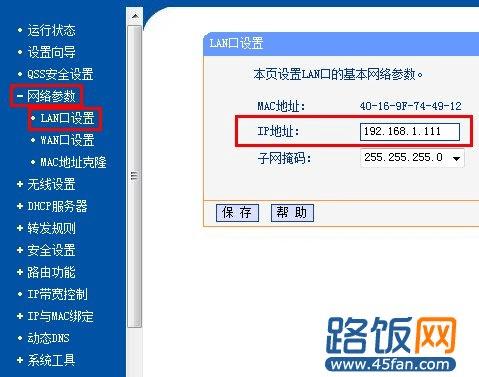 第二步:更改路由器的IP地址(“网络参数”---“LAN口设置”),注意ip地址不要跟主路由器的ip地址重复,否则会出现掉线的情况。